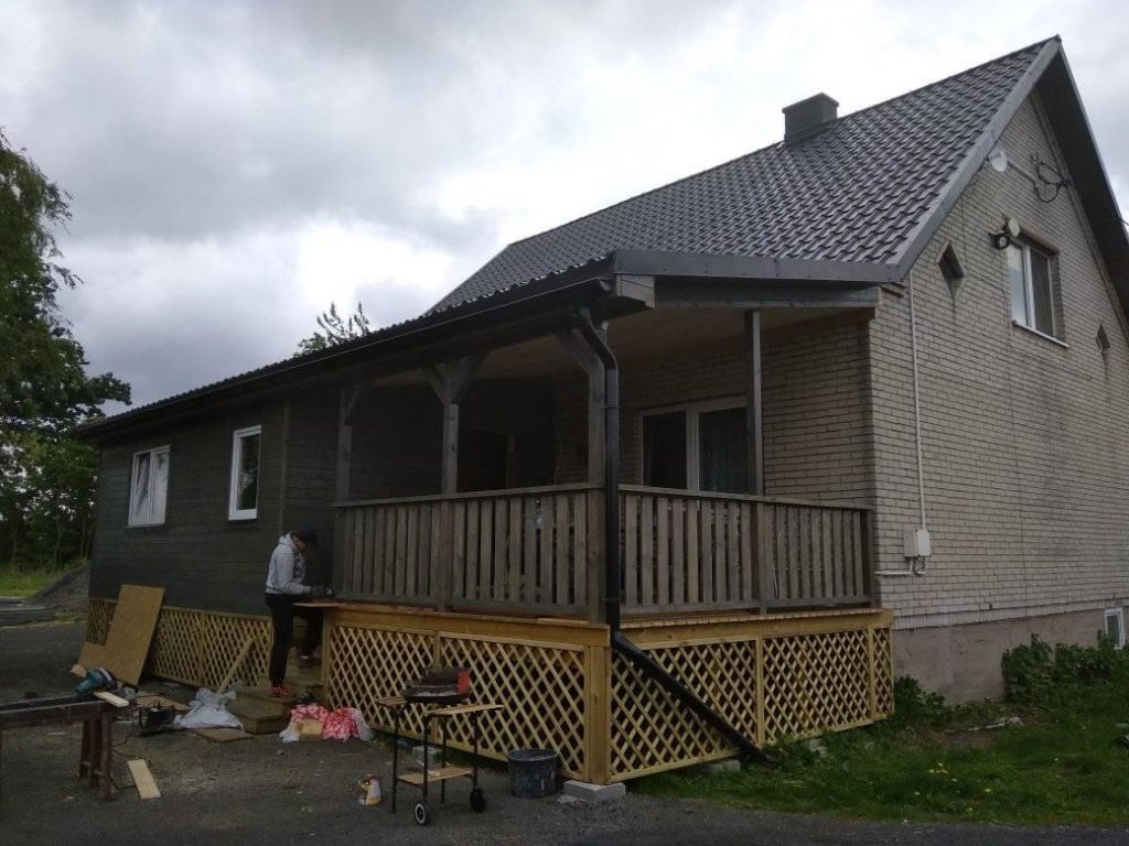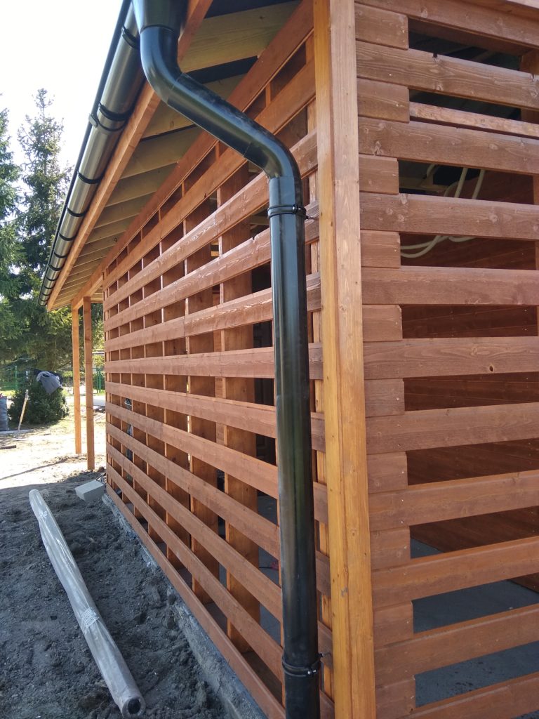 Drewniana dobudówka do murowanego domu. Dom zyskał dodatkowe pomieszczenie użytkowe oraz zadaszony taras